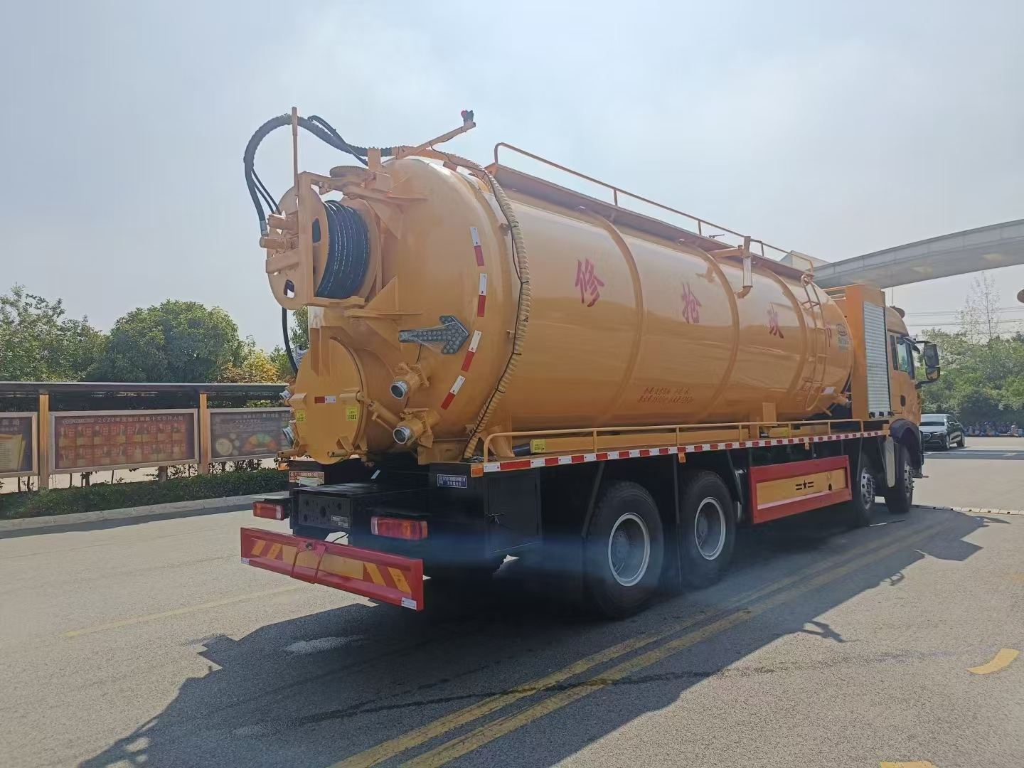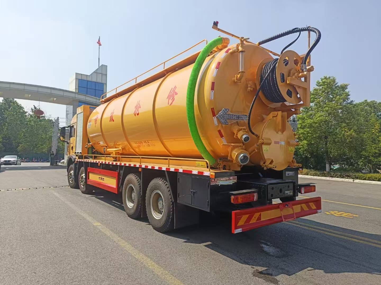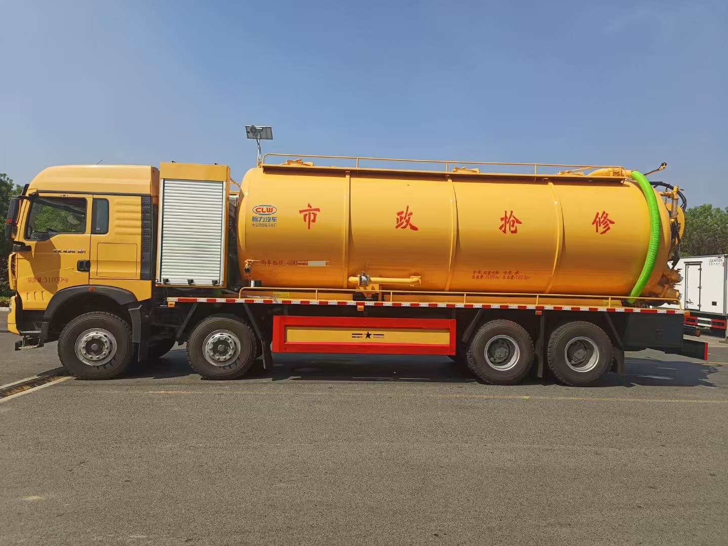 | 上裝配置 | 罐體總容積約33立方,清水箱約10立方,其余為污水罐,加強大架,兩倉互通,采用8mm碳鋼制作,吸污部分,副發(fā)采用420馬力配258水循環(huán)泵,8米吸污管,罐體兩側加寬平臺加護欄,后部開一個600mm液壓開啟排污口,一個150排污球閥,和一個100的排污球閥,100內抽球閥,后部左右各一個箭頭燈,配品浮350流量,配100米內徑25定制耐磨高壓管,帶卷盤,卷盤液壓左右旋轉。 | ||
